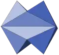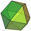 In their spatial relationships the cuboctahedron, icosahedron, Jessen's icosahedron, and octahedron nest like Russian dolls[a] and are related by a helical contraction.[3] The contraction begins with the square faces of the cuboctahedron folding along their diagonals to form pairs of triangles. The 12 vertices of the cuboctahedron spiral inward (toward the center) and move closer together until they reach the points where they form a regular icosahedron; they move slightly closer together until they form a Jessen's icosahedron; and they continue to spiral toward each other until they coincide in pairs as the 6 vertices of the octahedron.[b]