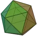 - β Forcing any pair of parallel long edges slightly apart expands the polyhedron, forcing all 3 pairs apart similarly until they become chords of the regular icosahedron, at which point the β6 β 2.449 short edges have stretched only ~1% to a length of 4/Ο β 2.472. If the short edges are elastic enough that they can be stretched ~15% to 2β2 β 2.828 the long edges will become the square face diagonals of the cuboctahedron (at the limit of expansion).