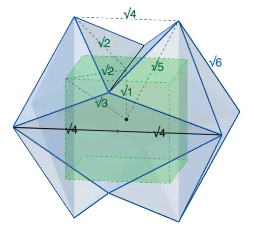 - β Forcing any pair of parallel long edges toward each other contracts the polyhedron, forcing all 3 pairs toward each other similarly until they coincide and become the 3 orthogonal axes of the regular octahedron. At that point (the limit of contraction) the β6 β 2.449 short edges have also stretched (not contracted!) to their limit length of 2β2 β 2.828, and now coincide in pairs as the 12 edges of the regular octahedron.