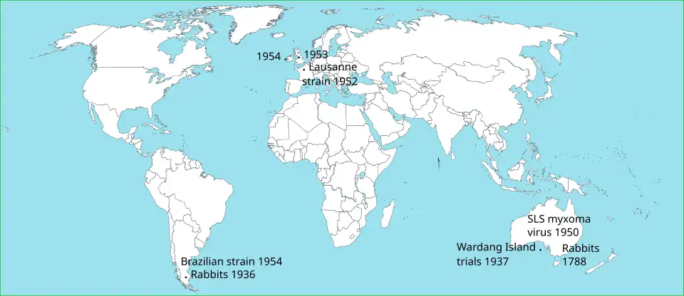 European rabbits were brought to Australia in 1788 by early English settlers (see Rabbits in Australia). Initially used as a food source, they later became feral and their numbers soared. In November 1937, the Australian Council for Scientific and Industrial Research used Wardang Island to conduct its first field trials of myxomatosis, which established the methodology for the successful release of the myxoma virus throughout the country.[21] In 1950, the SLS strain of myxoma virus from the South American tapeti (Sylvilagus brasiliensis) was released in Australia as a biological control agent against feral rabbits. The virus was at first highly lethal, with an estimated case fatality rate of close to 99.8%. Within a few years, however, this strain was replaced by less virulent ones, which permitted longer survival of infected rabbits and enhanced disease transmission. The virus created strong selection pressure for the evolution of rabbits resistant to myxomatosis. As rabbits became more resistant the viral strains responded by becoming more virulent.[2]