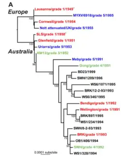 - ↑ 2.0 2.1 Kerr, Peter (2017). "Genomic and phenotypic characterization of myxoma virus from Great Britain reveals multiple evolutionary pathways distinct from those in Australia". PLOS Pathogens 13 (3): e1006252. doi:10.1371/journal.ppat.1006252. PMID 28253375. PMC 5349684. //www.ncbi.nlm.nih.gov/pmc/articles/PMC5349684/.