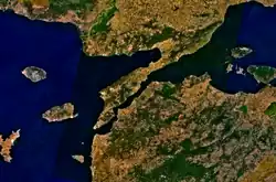 Orhan's declaration was indicative of the extent of his confidence in his beylik's strength compared to its neighbours, as well as the intention of his emerging state to inherit the governorship of all the lands of Asia Minor that were once part of the Sultanate of Rûm.[70] At the same time, the Kayıs' push towards the west was based on their desire to secure a front on the southern coast of the Marmara Sea, and the location of the Karasid beylik fulfilled this goal, so, Orhan aspired to annex it. The Karasids were at the forefront of the Turkmen emirates that crossed the strait of Çanakkale raiding the Gallipoli peninsula and Thrace in Rumelia, years before their Kayı cousins decided to do so themselves.[71]