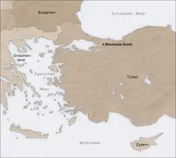 After completing the annexation of the Karasid beylik, Orhan turned his attention again to Nicomedia, aspiring to annex it, not caring about the peace treaty concluded with the Byzantines previously.[74] John Kantakouzenos mentioned that during this time, Emperor Andronikos III went out on a long journey with an army to confront the Arnaout (Albanian) rebels, and there was no possibility of his coming to the Nicomedia Peninsula. Kantakouzenos also referred to the city’s ruler at that time who was a princess from the emperor’s family. Orhan did not miss that opportunity and hastened to besiege Nicomedia. By the time Orghan reached there, all the Muslim warriors in the vicinity joined him. The people of the city did not withstand the siege due to a lack of supplies, so the princess decided to surrender and agreed on Orhan's terms.[75]