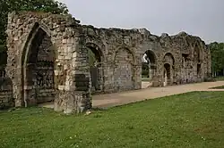 Æthelflæd died at Tamworth on 12 June 918 and her body was carried 75 miles (121 km) to Gloucester, where she was buried with her husband in their foundation, St Oswald's Minster.[17] According to the Mercian Register, Æthelflæd was buried in the east porticus. A building suitable for a royal mausoleum has been found by archaeological investigation at the east end of the church and this may have been St Oswald's burial place. Placement next to the saint would have been a prestigious burial location for Æthelred and Æthelflæd. William of Malmesbury wrote that their burial places were found in the south porticus during building works in the early twelfth century. He may have been misinformed about the position, but it is also possible that the tombs were moved from their prestigious position next to the saint when the couple became less known over time, or when tenth-century kings acted to minimise the honour paid to their Mercian predecessors.[63]
