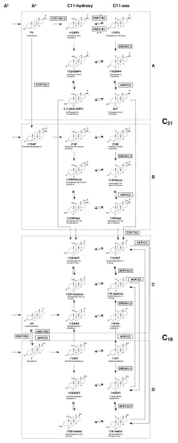 These steroids correspond to the "C11-hydroxy" column in #Figure 3. This sequence is replicated in the parallel column of "C11-oxo" steroids, in which are a result of 11β-oxidation of the alcohol to a ketone.[17] HSD11B1 catalyzes both oxidation of the 11OH substrates and reduction of the 11K substrates, while HSD11B2 only catalyzes the oxidation. It should be noted that while 11β-hydroxylation by CYP11B2 has been shown in vitro, this isozyme is only known to be expressed in the zona glomerulosa of the adrenal cortex which would be unlikely to encounter the Δ4 substrates.