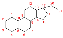 - ↑ "IUPAC-IUB Joint Commission on Biochemical Nomenclature (JCBN). The nomenclature of steroids. Recommendations 1989". Eur J Biochem 186 (3): 430. 1989. doi:10.1111/j.1432-1033.1989.tb15228.x. PMID 2606099. "3S-1.1. Numbering and ring letters Steroids are numbered and rings are lettered as in formula 1"