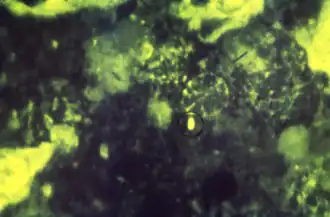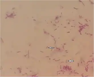 Melioidosis is caused by gram-negative, motile, saprophytic bacteria named Burkholderia pseudomallei.[13] The bacteria are usually opportunistic, facultative intracellular pathogens.[13] It is also aerobic and oxidase test positive.[3] A granule at the centre of the bacterium makes it resemble a “safety pin” when Gram stained.[3] The bacteria emit a strong soil smell after 24 to 48 hours of growth in culture, however smelling for the identification of the bacteria is not recommended for routine laboratory practice. One of the factors causing B. pseudomallei's resistance to various kinds of antibiotics is because of its production of a glycocalyx polysaccharide capsule.[14] It is generally resistant to gentamicin and colistin but sensitive to co-amoxiclav. B. pseudomallei is a biosafety level 3 pathogen which requires specialized laboratory handling.[3] In humans and animals, another similar organism named Burkholderia mallei is the causative agent of the disease glanders.[1] B. pseudomallei can be differentiated from another closely related, but less pathogenic species B. thailandensis by its ability to assimilate arabinose.[9] B. pseudomallei is highly adaptable to various host environments ranging from inside mycorrhizal fungi spores to amoeba.[3] Its adaptability may give it a survival advantage in the human body.[1]