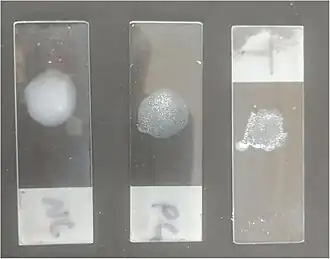 Bacterial culture has 60% sensitivity in diagnosing melioidosis.[22] B. pseudomallei is never part of human flora. Therefore, any growth of the bacteria is diagnostic of melioidosis. Other samples such as throat, rectal swabs, pus from abscesses, and sputum can also be used for culture.[1] However, culture from CSF is difficult because in one case series, only 29% of the neuromelioidosis cases are culture positive.[9] When bacteria do not grow from people strongly suspected of having melioidosis, repeated cultures should be taken as subsequent cultures can become positive.[1] B. pseudomallei can be grown on any blood agar, MacConkey agar, and agar containing antibiotics such as Ashdown's medium (containing gentamicin),[9] and Ashdown's broth (containing colistin)[2] for better isolation of B. pseudomallei from other types of bacteria.[9] Agar plates for melioidosis should be incubated at 37 °C (98.6 °F) in air [3] and inspected daily for four days. On the agar plates, B. pseudomallei forms creamy, non-haemolytic, colonies after 2 days of incubation. After 4 days of incubation, colonies appear dry and wrinkled.[1] Colonies of B. pseudomallei that are grown on Francis medium (a modification of Ashdown medium with gentamicin concentration increased to 8 mg/L and neutral red indicator replaced with 0.2% bromocresol purple) are yellow.[23] For laboratories located outside endemic areas, Burkholderia cepacia selective agar can be used if Ashdown's medium is not available.[3] It is important not misinterpret the bacterial growth as Pseudomonas or Bacillus spp. Other biochemical screening tools can also be used for detecting B. pseudomallei, including the API 20NE or 20E biochemical kit combined with Gram stain, oxidase test, typical growth characteristics, and resistance to certain antibiotics of the bacteria.[2] API 20NE biochemical kit is 99% sensitive in identifying B. pseudomallei.[9]