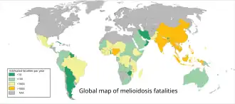 - ↑ Limmathurotsakul D; Golding N; Dance DA; Messina JP; Pigott DM; Moyes CL; Rolim DB; Bertherat E et al. (11 January 2016). "Predicted global distribution of Burkholderia pseudomallei and burden of melioidosis". Nature Microbiology 1 (1): 15008. doi:10.1038/nmicrobiol.2015.8. PMID 26877885. PMC 4746747. //www.ncbi.nlm.nih.gov/pmc/articles/PMC4746747/.