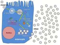 - ↑ Ruiz MC; Leon T; Diaz Y; Michelangeli F (2009). "Molecular biology of rotavirus entry and replication". The Scientific World Journal 9: 1476–97. doi:10.1100/tsw.2009.158. PMID 20024520.