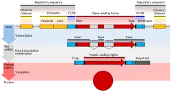 Genes consist of multiple sequence elements that together encode the functional product and regulate its expression. Despite their fundamental importance, there are few freely available diagrams of gene structure. Presented here are two figures that summarise the different structures found in eukaryotic and prokaryotic genes. Common gene structural elements are colour-coded by their function in regulation, transcription, or translation.