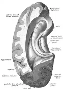 The hippocampus (named after its resemblance to the seahorse, from the Greek ἱππόκαμπος, "seahorse" from ἵππος hippos, "horse" and κάμπος kampos, "sea monster") is a major component of the brains of humans and other vertebrates. Humans and other mammals have two hippocampi, one in each side of the brain. It belongs to the limbic system and plays important roles in the consolidation of information from short-term memory to long-term memory and spatial memory that enables navigation. The hippocampus is located under the cerebral cortex;(allocortical) and in primates it is located in the medial temporal lobe, underneath the cortical surface. It contains two main interlocking parts: the hippocampus proper (also called Ammon's horn) and the dentate gyrus. [...] In Alzheimer's disease (and other forms of dementia), the hippocampus is one of the first regions of the brain to suffer damage; short-term memory loss and disorientation are included among the early symptoms. Damage to the hippocampus can also result from oxygen starvation (hypoxia), encephalitis, or medial temporal lobe epilepsy. People with extensive, bilateral hippocampal damage may experience anterograde amnesia (the inability to form and retain new memories). In rodents as model organisms, the hippocampus has been studied extensively as part of a brain system responsible for spatial memory and navigation. Many neurons in the rat and mouse hippocampus respond as place cells: that is, they fire bursts of action potentials when the animal passes through a specific part of its environment. Hippocampal place cells interact extensively with head direction cells, whose activity acts as an inertial compass, and conjecturally with grid cells in the neighboring entorhinal cortex. Since different neuronal cell types are neatly organized into layers in the hippocampus, it has frequently been used as a model system for studying neurophysiology. The form of neural plasticity known as long-term potentiation (LTP) was first discovered to occur in the hippocampus and has often been studied in this structure. LTP is widely believed to be one of the main neural mechanisms by which memories are stored in the brain. doi: 10.15347/WJM/2017.003