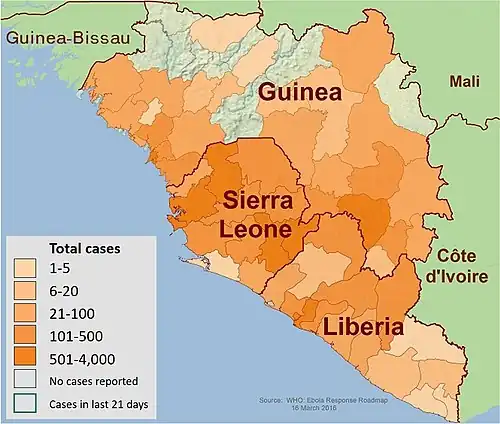 It was adapted from the Wikipedia page Western_African_Ebola_virus_epidemic and contains some or all of that page's content licensed under a CC BY-SA license. Post-publication review comments or direct edits can be left at the version as it appears on Wikipedia.