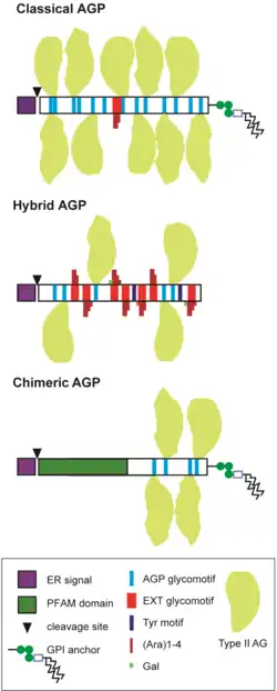 AGPs belong to large multigene families and are divided into several sub-groups depending on the predicted protein sequence.[12][4][13][14][2][3][15] "Classical" AGPs include the GPI-AGPs that consist of a signal peptide at the N-terminus, a PAST-rich sequence of 100-150 aa and a hydrophobic region at the C-terminus that directs addition of a GPI-anchor; non GPI-AGPs that lack the C-terminal GPI signal sequence, Lysine(K)-rich AGPs that contain a K-rich region within the PAST-rich backbone and AG-peptide that have a short PAST-rich backbone of 10-15 aa (Figure 2). Chimeric AGPs consist of proteins that have an AGP region and an additional region with a recognised protein family (Pfam) domain. Chimeric AGPs include fasciclin-like AGPs (FLAs), phytocyanin-like AGPs (PAGs/PLAs, also known as early-nodulin-like proteins, ENODLs) and xylogen-like AGPs (XYLPs) that contain lipid-transfer-like domains.[1] Several other putative chimeric AGP classes have been identified that include AG glycomotifs associated with protein kinase, leucine-rich repeat, X8, FH2 and other protein family domains.[15][16][17] Other non-classical AGPs exist such as those containing a cysteine(C)-rich domain, also called PAC domains, and/or histidine(H)-rich domain,[18][19] as well as many hybrid HRGPs that have motifs characteristic of AGPs and other HRGP members, usually extensin and Tyr motifs.[18][20][1][2][3] AGPs are evolutionarily ancient and have been identified in green algae as well as Chromista and Glaucophyta.[2][3][21] Found throughout the entire plant lineage, land plants are suggested to have inherited and diversified the existing AGP protein backbone genes present in algae to generate an enormous number of AGP glycoforms.