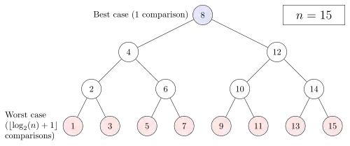 Binary search runs in logarithmic time in the worst case, making comparisons, where is the number of elements in the array, the is Big O notation, and is the logarithm.[5] Binary search is faster than linear search except for small arrays. However, the array must be sorted first to be able to apply binary search. There are specialized data structures designed for fast searching, such as hash tables, that can be searched more efficiently than binary search. However, binary search can be used to solve a wider range of problems, such as finding the next-smallest or next-largest element in the array relative to the target even if it is absent from the array.