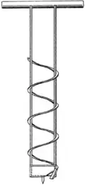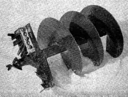 A soil sampling auger contains a pair of blades at the bottom of an enclosed cylinder; it can be driven and rotated by hand to pick up soft soil.[67] A similar design, called a spoon-borer, has been used for ice drilling, though it is not effective in hard ice.[68] A version used by Erich von Drygalski in 1902 had two half-moon cutting blades set into the base of the cylinder in such a way as to allow the ice cuttings to accumulate in the cylinder, above the blades.[68][69][note 2]