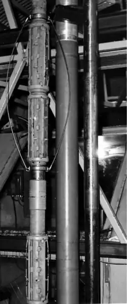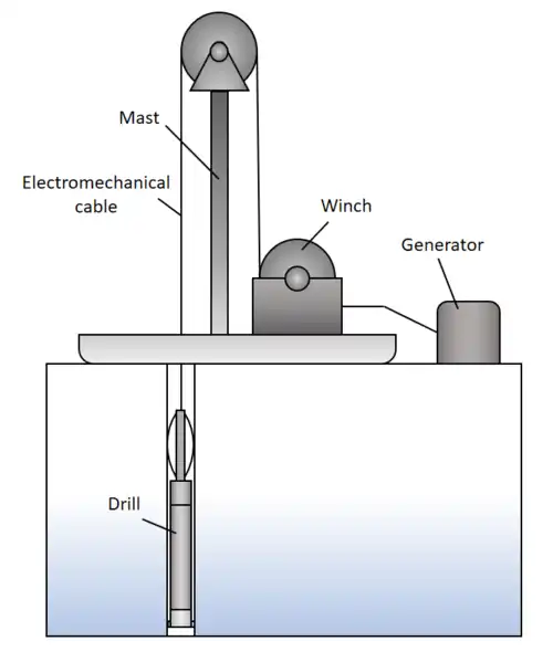 Most coring drills are designed to retrieve cores that are no longer than 6 metres (20 ft), so drilling must stop each time the hole depth is extended by that amount, so that the core can be retrieved.[48] A drill string that must be assembled and disassembled in segments, such as pipe sections that must be screwed together, takes a long time to trip in and out; a cable which can be continuously winched up, or a drill string that is flexible enough to be coiled, significantly reduces tripping time.[47][34] Wireline drills have a mechanism that allows the core barrel to be detached from the drill head and winched directly to the surface without having to trip out the drill string. Once the core is removed, the core barrel is lowered to the bottom of the hole and reattached to the drill.[59]