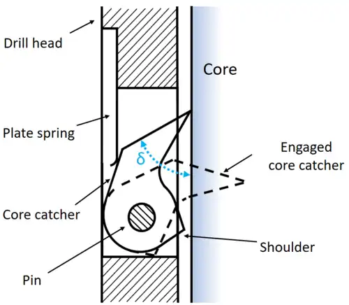 To retrieve a core, an annulus of ice must be removed from around the cylindrical core.[56] The core should be unbroken, which means that vibrations and mechanical shocks must be kept to a minimum, and changes in temperature which could cause thermal shock to the core must also be avoided.[57] The core must be kept from melting caused by heat generated either mechanically from the drilling process,[58] from the heat of compressed air if air is used as the drilling fluid,[33][34] or from a thermal drill, and must not be contaminated by the drilling fluid.[41] When the core is about to be retrieved, it is still connected to the ice beneath it, so some method of breaking it at the lower end must be provided, and of gripping it so it does not fall from the core barrel as it is brought to the surface, which must be done as quickly and safely as possible.[48]