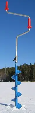 Augers have long been used for drilling through ice for ice fishing. Augers can be rotated by hand, using a mechanism such as a T handle or a brace bit, or by attaching them to powered hand drills.[70] Scientific uses for non-coring augers include sensor installation and determining ice thickness. Augers have a helical screw blade around the main drilling axis; this blade, called the "flighting", carries the ice cuttings up from the bottom of the hole.[30] For drilling deeper holes, extensions can be added to the auger, but as the auger gets longer it becomes more difficult to rotate. With a platform such as a stepladder, a longer auger can be rotated from higher off the ground.[70]