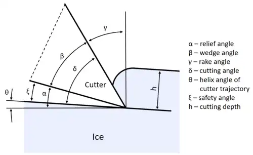 Mechanical drilling produces pieces of ice, either as cuttings, or as granular fragments, which must be removed from the bottom of the hole to prevent them from interfering with the cutting or percussing action of the drill.[24] An auger used as the cutting tool will naturally move ice cuttings up its helical flights.[30] If the drill's action leaves the ice chips on top of the drill, they can be removed by simply raising the drill to the surface periodically.[31] If not, they can be brought to the surface by lowering a tool to scoop them up, or the hole can be kept full of water, in which case the cuttings will naturally float to the top of the hole. If the chips are not removed, they must be compacted into the walls of the borehole, and into the core if a core is being retrieved.[32]