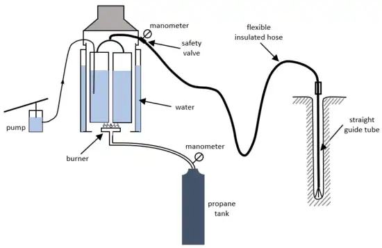 If the ice is to be melted instead of cut, then heat must be generated. An electrical heater built into the drill string can heat the ice directly, or it can heat the material it is embedded in, which in turn heats the ice. Heat can also be sent down the drill string; hot water or steam pumped down from the surface can be used to heat a metal drillhead, or the water or steam can be allowed to emerge from the drillhead and melt the ice directly.[24] In at least one case a drilling project experimented with heating the drillhead on the surface, and then lowering it into the hole.[25]