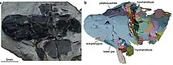 In 1980, Gupta met Philippe Janvier at the Museum of Natural History in Paris[38] and showed him "a magnificent fossil fish skull" which he brought along.[16] He claimed that the fossil was collected by him from Zanskar, Ladakh, at the foothills of the Himalayas. Recognising the fossil as a new species, Janvier made the identification and with Gupta submitted the discovery in Recent Researches in Geology.[38] Shortly after, Janvier went to Sweden where he met Mee-mann Chang (also Zhang Miman) from the Chinese Institute of Vertebrate Paleontology and Paleoanthropology who was working on her doctoral research on fish fossils from China.[39] Janvier immediately noticed that some of Chang's fossils were exactly like the one he and Gupta had recently described. When inquired, Chang explained to him that the particular specimen was a Devonian coelacanth she named Youngolepis praecursor (Figure 3) that was found in Yunnan region and North Vietnam, and so common in those regions that the fossils were frequently used as gifts to visitors. Chang had already published the discovery in January 1981.[40] Janvier told Gupta to hold their publication, but eventually got it published in 1982 with a few modifications based on Chang's paper.[41][42] With an unsettled mind on the origin of the Himalayan fossil, Janvier reported a note of concern in Bulletin of the Indian Geologists Association[43] remarking that Chang's and Gupta's specimens were "strikingly similar."[38] Although Gupta avowed that he had never been to the fossil site in China,[42] it was known that he had a trip to China just before going to France. Janvier was convinced that Gupta had fooled him: "Now, there is no evidence that Gupta brought the fish fossil with him from China, but I'm 99% sure he did."[16]