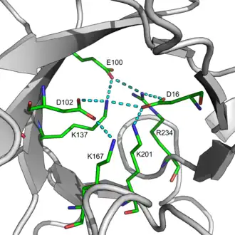 Salt bridges within TIM barrel pores are thought to contribute to the overall stability of the fold. An example of a large salt bridge network can be found in 2-deoxyribose-5-phosphate aldolase (Figure 3). This network was found to be conserved across the Class I aldolase family.[3]
