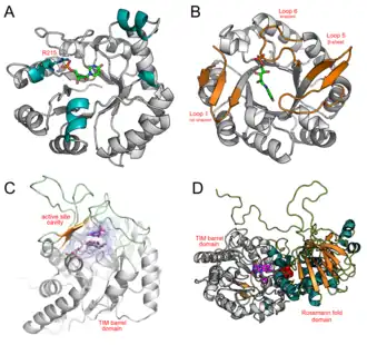 - ↑ 2.0 2.1 2.2 Wierenga, RK (2001). "The TIM-barrel fold: a versatile framework for efficient enzymes". FEBS Letters 492 (3): 193-198. doi:10.1016/s0014-5793(01)02236-0.