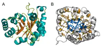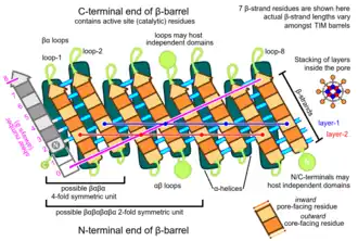 - ↑ 5.0 5.1 Reardon, D; Farber, GK (1995). "The structure and evolution of alpha/beta barrel proteins". The FASEB Journal 9 (7): 497-503. doi:10.1096/fasebj.9.7.7737457.
