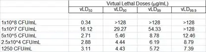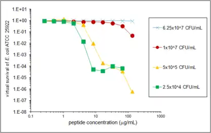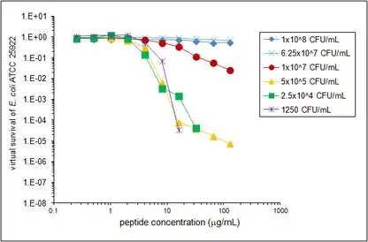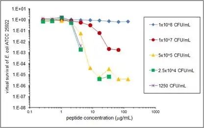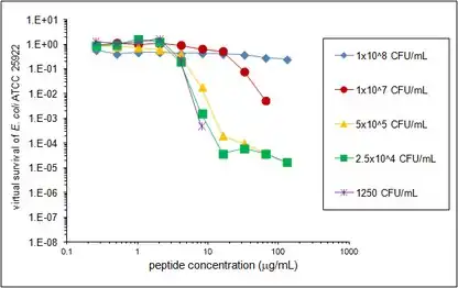 An inoculum effect has been previously described for many antimicrobial agents, such that the agent is less effective when more bacteria are added to the assay.[23] This effect is often observed with beta lactams when assayed against beta lactamase producing bacteria. The inoculum effect was potentially relevant to a study of HNP1, pro LL-37 and LL-37 that included both traditional colony counting and VCC side by side.[2] In that report, it was found that traditional colony count survival values were less than virtual survival values for all peptides and strains tested. Because the inoculum of bacteria was 20-fold greater in the VCC assay compared to the standardized traditional colony count protocol used, the difference could have been due to an inoculum effect, although the effect would have been the reverse of the inoculum effect normally seen with other antimicrobial agents, since the higher inoculum showed more activity. This possibility was investigated in a series of VCC experiments mainly focusing on the defensin HNP1 and the bacterial strains E. coli, S. aureus and B. cereus. The results of one of those experiments is presented here as an example VCC assay, and the Microsoft Excel file used for its data analysis is included with this publication. The laboratory procedure deviated from the procedure described above in that different dilution schemes in phosphate buffer were used to achieve inocula ranging from 1250 CFUv/mL to 1 x 108 CFUv/mL. The highest inoculum, 1 x 108 CFUv/mL, also required collecting cells using a microcentrifuge, discarding the supernatant media and resuspending them in a slightly smaller volume of buffer.