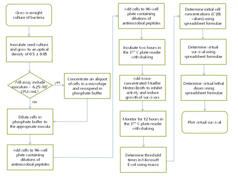 Antimicrobial susceptibility testing (AST) can be done on 96-well plates by diluting the antimicrobial agent at varying concentrations in broth inoculated with bacteria and measuring the minimum inhibitory concentration that results in no growth. However, these methods cannot be used to study some membrane-active antimicrobial peptides, which are inhibited by the broth itself. The virtual colony count procedure takes advantage of this fact by first exposing bacterial cells to the active antimicrobial agent in a low-salt buffer for two hours, then simultaneously inhibiting antimicrobial activity and inducing exponential growth by adding broth. The growth kinetics of surviving cells can then be monitored using a temperature-controlled plate reader. The time taken for each growth curve to reach a threshold change in optical density is then converted into virtual survival values, which serve as a measure of antimicrobial activity.