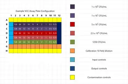 VCC users are cautioned to transfer cells in a small volume such as 10 microliters beneath a larger volume such as 90 μL, similar to the QGK calibration curves shown above and the calibration curves reported in the initial VCC publication,[1] but unlike the experimental procedure used to test defensin activity in that same paper. The improved pipetting technique was described in 2011 in the study of the biosafety level 3 (BSL-3) pathogen B. anthracis.[11] The original method published in 2005 involved the transfer of 50 μL of cell suspensions to 50 μL of liquid, which generates froth, bubbles and turbidity that is incompatible with a turbidimetric method when cells are transferred directly to the bottoms of the wells beneath the phosphate buffer solutions. Avoiding this problem by adding cell suspensions as droplets from above can cause aerosols that result in cross-contamination.[25] Bioaerosols of hazardous bacteria can also pose safety risks that can be reduced by conducting experiments within a biosafety cabinet.