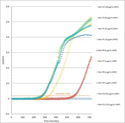 Another method commonly employed to measure antimicrobial activity in liquid is to expose dilution series of the antimicrobial agent to cells in rich broth such as Mueller-Hinton broth (MHB) in a 96-well plate, and then incubate the 96-well plate at 37 °C overnight. Each well will either become turbid with bacterial growth or remain clear. The minimum inhibitory concentration (MIC) is then reported as the lowest concentration that produces a clear well and thus inhibits growth.[8] Standardized MIC methods using MHB are not applicable to antimicrobial agents such as defensins, because defensins must be incubated in a low salt buffer, not rich broth, in order to measure their activity.