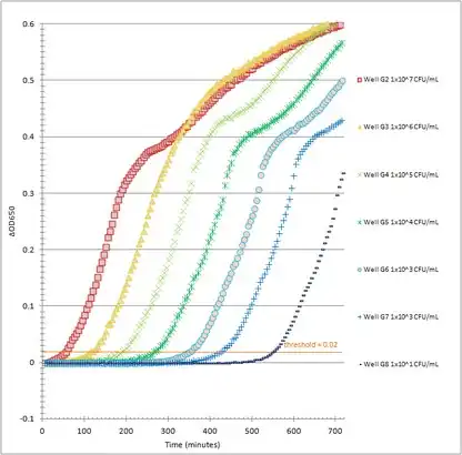 The method of enumeration[9] of surviving cells used by VCC is termed quantitative growth kinetics (QGK). It relates the time taken for the turbidity of a bacterial culture in a well of a microplate to reach a threshold in relation to calibration growth curves. Figure 2 shows a set of sextuplicate calibration growth curves. VCC calibration curves were originally done as a separate experiment occupying an entire microplate in sextuplicate. However, subsequent experiments with Staphylococcus aureus showed that this strain produces highly variable calibration slopes from day to day. Therefore, calibration curves were subsequently done singly on the same microplate and on the same day as the antimicrobial assay.