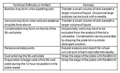 Three wells produced rare examples of anomalous growth curves, as shown in the spreadsheet, "Anomalous Growth Curves". First, the contamination control well H12 produced noisy data that included eight points above the threshold of 0.02. This level of noise is rarely seen in VCC experiments, and the threshold of 0.02 was initially chosen because it was above all noise generated in the initial VCC study. This degree of scatter may be caused by transient condensation on the lid of the 96-well plate. Second, well C2 produced an anomalous biphasic growth curve that produced a lower threshold time than expected based on the rest of the survival curve. The unusual shape of the curve can be readily detected by examining the plot in the "Lognormal All" tab; it is clearly not parallel to the other curves at approximately 200 minutes. This type of curve is attributable to persistent condensation on the lid of the 96-well plate, perhaps caused by an adhesive condensation nucleus such as a dust particle adhering to the lid. Both of these first two types of anomalies could potentially be averted by applying a small concentration of detergent to the lid at the start of the assay, which alleviated similar problems for Brewster. [9] Because the detergent might diffuse into the wells, and because of the rarity of these artifacts, this measure was not routinely employed in VCC experiments. Third, well B12 produced a single point of lower than expected optical density at time zero of the growth curve. Note the unusual jump between time zero and five minutes. This anomaly could possibly be caused by a bubble in the light path of the plate reader at time zero, which then moves to the meniscus or is popped by the five minute time point due to the shaking of the plate. Because the threshold time of this output control well is used in the VCC calculations in the spreadsheet "assay", the time zero result was deleted and the rest of the growth curve shifted over one cell to the left, such that the five minute tine point became time zero and so forth. Then the macro was run again to produce the new threshold time, which changed from 4.86 to 4.99 minutes. The vLD50 value for the 1x108 CFU/mL inoculum was the same at two decimal places after the recalculation. A summary of various technical difficulties and artifacts encountered in VCC assays is shown in Figure 8.