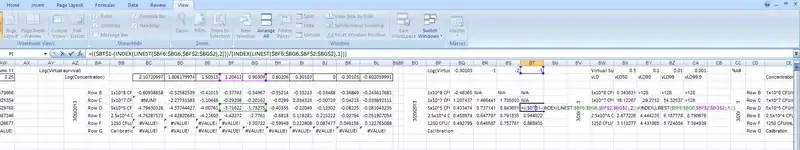 The next section of the spreadsheet "assay" transforms the virtual survival values to a logarithmic scale, then performs a linear regression to determine where the curve crosses the virtual survival thresholds of 0.5, 0.1, 0.01, and 0.001 for virtual lethal doses (vLD) of vLD50, vLD90, vLD99, and vLD99.9, respectively. Although these values are similar conceptually to lethal doses reported by traditional colony count assays, it should be noted that VCC threshold times are also delayed by lag times in addition to bactericidal killing. The formulas in this section of the spreadsheet must be painstakingly adjusted in order to perform the calculations correctly. For example, in order to calculate vLD99.9 for HNP1 against the standard inoculum of 5x1o5 CFU/mL, cell BT6 must be double-clicked to reveal the formula as shown in Figure 6. The green box must then be moved to cells BF6 and BG6, which bracket the desired log virtual survival value of -3. Then, the purple box must be adjusted to cells BF2 and BG2 to select the appropriate log(concentration) values for the formula. Once these adjustments have been made, pressing return yields the correct log(virtual survival) value in cell BT6, which is 1.09542. This procedure must be repeated for each cell in the range BQ4-BT8, except where the threshold log(virtual lethal dose) in cells BQ1-BT1 lies outside the range of log(virtual survival) values. In this case, not applicable (NA) is entered manually. The virtual lethal dose section in columns BW-CA is simply 10 to the exponent of the log(virtual lethal dose). These values are also shown in cells CS4-CV8 and Figure 7.