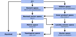 While modern mathematics use many types of spaces, such as Euclidean spaces, linear spaces, topological spaces, Hilbert spaces, or probability spaces, it does not define the notion of "space" itself. [...] A space consists of selected mathematical objects that are treated as points, and selected relationships between these points. The nature of the points can vary widely: for example, the points can be elements of a set, functions on another space, or subspaces of another space. It is the relationships that define the nature of the space. More precisely, isomorphic spaces are considered identical, where an isomorphism between two spaces is a one-to-one correspondence between their points that preserves the relationships. For example, the relationships between the points of a three-dimensional Euclidean space are uniquely determined by Euclid's axioms, and all three-dimensional Euclidean spaces are considered identical. Topological notions such as continuity have natural definitions in every Euclidean space. However, topology does not distinguish straight lines from curved lines, and the relation between Euclidean and topological spaces is thus "forgetful". Relations of this kind are sketched in Figure 1, and treated in more detail in the Section "Types of spaces". It is not always clear whether a given mathematical object should be considered as a geometric "space", or an algebraic "structure". A general definition of "structure", proposed by Bourbaki, embraces all common types of spaces, provides a general definition of isomorphism, and justifies the transfer of properties between isomorphic structures. doi: 10.15347/WJS/2018.002