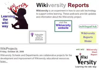 The Wikiversity Reports podcasts are of several types. Some of the podcasts are periodical reports on the status of the Wikiversity project. Other reports are tutorials or "how tos" that explain features of the Wiki user interface. Other Wikiversity Reports podcasts describe some specific educational content of Wikiversity.